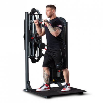 Тренажер двойного назначения для комплексной тренировки рук, эффективно воспроизводящий сгибание рук для бицепсов и разгибание для трицепсов в положении стоя.