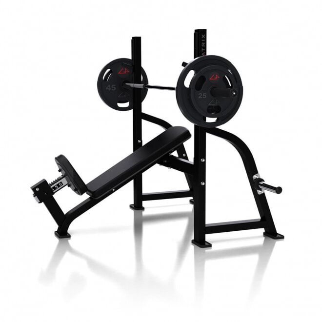 Скамья наклонная для жима G1-FW164 от компании Matrix представляет профессиональный тренажер со стойками. Имеются наклонные стойки, предназначенные для большей стабильности при тренировках и удобства жима. Под олимпийские диски предусмотрены специальные держатели.