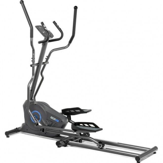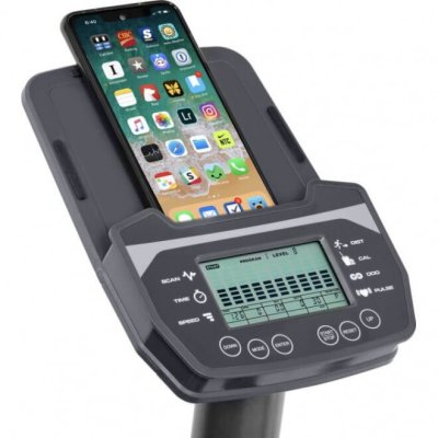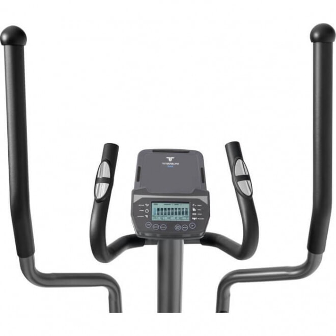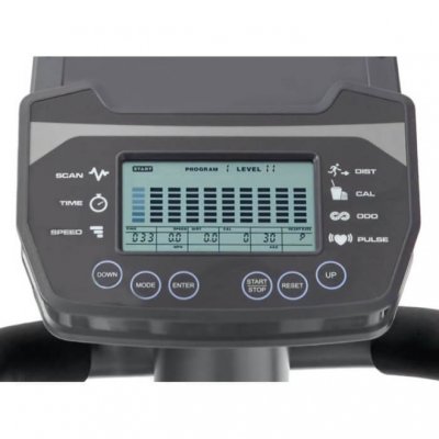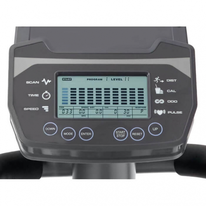 Тренировочный компьютер представлен черно-белым LCD-дисплеем с удобной подставкой под смартфон или планшет. На экран выводятся все основные параметры тренировки – программный профиль, время, дистанция, скорость, калории, уровни нагрузки, обороты в мин. и пульс. 12 предустановленных программ рассчитаны на тренировку скоростных качеств, выносливости, укрепления сердечно-сосудистой системы и похудания. Нагрузка регулируется электронным способом через консольные клавиши в 16 положениях. Измерение пульса происходит путем удержания ладоней на сенсорных датчиках пульса, расположенных на поручнях. К числу дополнительных характеристик эллипсоида относятся такие опции как транспортировочные ролики и компенсаторы неровностей пола.