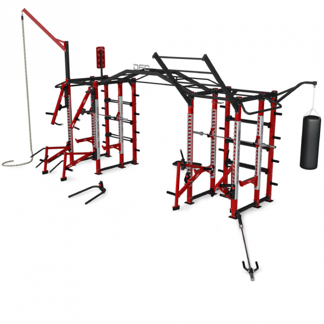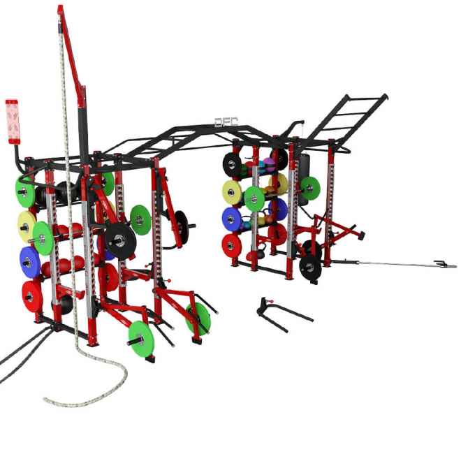 - 9 дополнительных тренировочных станций: пирамидный рукоход, перекладина для подтягиваний длиной 3м, 2 боковые перекладины для подтягиваний, боксерский мешок (груша), канат для лазания, крепление для грифа, мишень для мячей и боевой канат