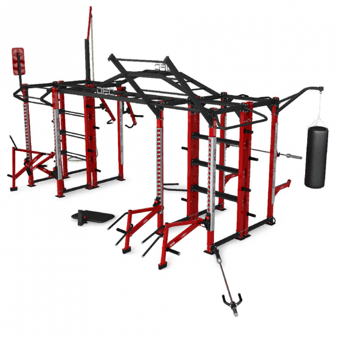 - 9 дополнительных тренировочных станций: горизонтальная лестница, наклонная лестница, 2 боковые тяговые штанги, боксерская груша, альпинистская веревка, силовой шарнир, мишень для мяча и боевая веревка.