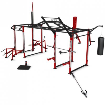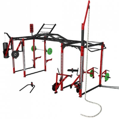 - 9 дополнительных тренировочных станций: горизонтальный рукоход, пирамидный рукоход, 2 боковые перекладины для подтягиваний, боксерский мешок (груша), канат для лазания, крепление для грифа, мишень для мячей и боевой канат