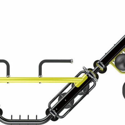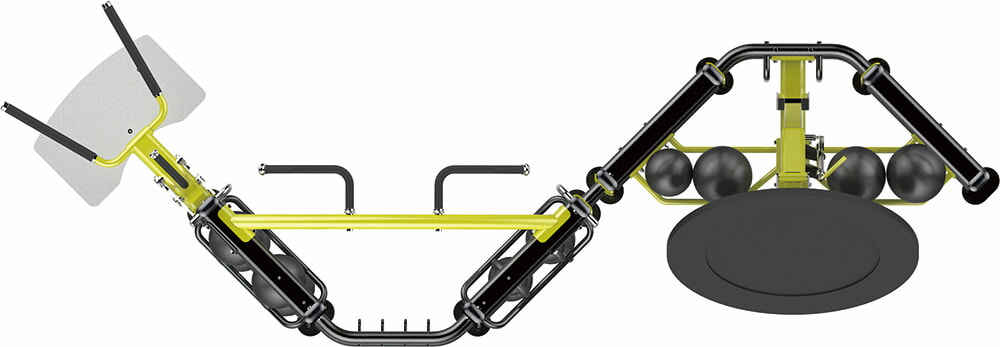 Комплекс из 2х модулей в форме буквы 'S', состоит из: зоны растяжки и зоны реакции, соединенных между собой S-образным соединением, включающий плио платформу, опору для отжиманий (брусья) и шарнирный крепеж для грифа.