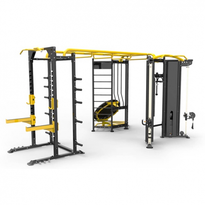 Комплекс из 3х модулей в форме буквы 'T', состоит из: зоны реакции, зоны силовой нагрузки (силовой рамы) и двойной регулируемой тяги, соединенных между собой посредством «рукохода» и специальной перекладины, включающий плио платформу, опору для отжиманий (брусья) и шарнирный крепеж для грифа.