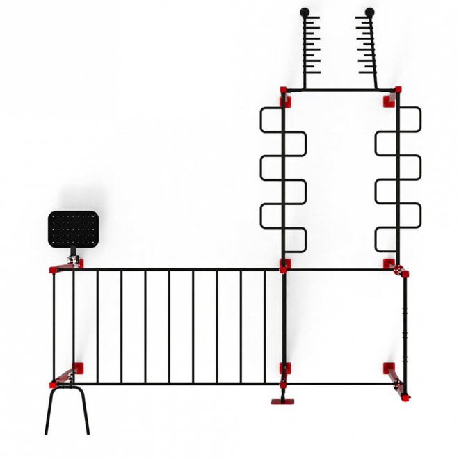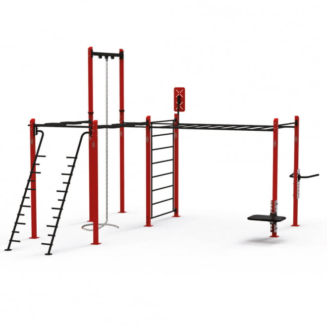 Подходящая конструкция для кросс-тренинга, функциональной тренировки и гимнастики. Различные аксессуары делают ее подходящей для пользователей любого уровня. Возможность подвешивать гимнастические кольца и канаты повышает результативность и более продвинутых пользователей. Две L-стороны имеют разную длину: одна со змееобразными перекладинами и наклонной плоскостью, а у другой две разные лестницы и аксессуары с краю. Специфическая форма модулей в виде L дает больше пространства и возможность одновременного размещения большего числа пользователей.