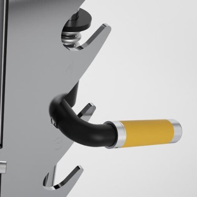 - Конструкция крюков и роликовая система удерживания штанги помогают пользователям с уверенностью вставлять штангу в упоры.