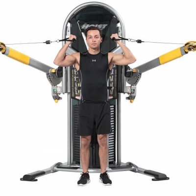 Кабели тренажера HOIST HD-4000 Simple Trainer остаются центрированными по оси вращения рук, предотвращая провисание при выполнении регулировок, обеспечивая плавное и стабильное ощущение для пользователей. Аксессуары включают стабилизирующие ручки и держатель для бутылки с водой или телефона.