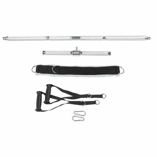 - В комплект также входит алюминиевый длинный и короткий гриф, пара рукояток, петля для лодыжки, стропа для подтягиваний «с помощью».