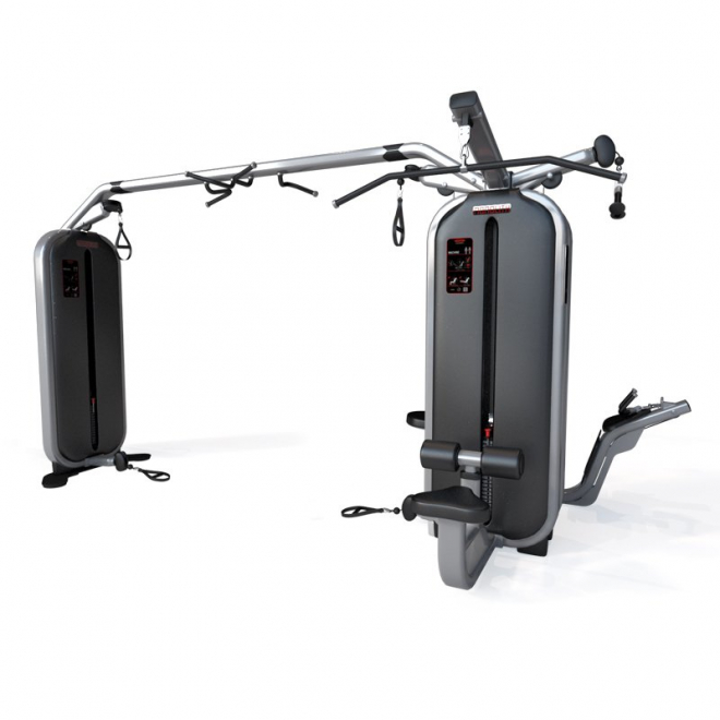 Jungle Machine + Cable Station With Bar 1MTH115 + 1MTH116 - универсальный тренажер для проработки сразу нескольких групп мышц из серии Monolith, от Panatta. Данный станция предоставляет возможность тренироваться в группе из шести человек. Стандартная комплектация предусматривает ручку для жима вниз для проработки трицепса, рукоять для вертикальной тяги, многоцелевую рукоятку, а также 2 другие универсальные ручки. За выбор веса отвечает магнитный штифт, а весовой стек защищен кожухом из гофрированного ABS пластика. Прогрессивное увеличение нагрузки предусмотрено с узких сторон, и имеет шаг в 2,5 кг. Этот тренажер универсален, ведь сочетает в себе сразу 6 различных тренажера. Есть регулировка упорных валиков для ног, а наличие встроенного турника позволяет пользователю кроме других упражнений, выполнять еще и подтягивания. Стандартный цвет обивки - красный, другие цвета доступны опционально.