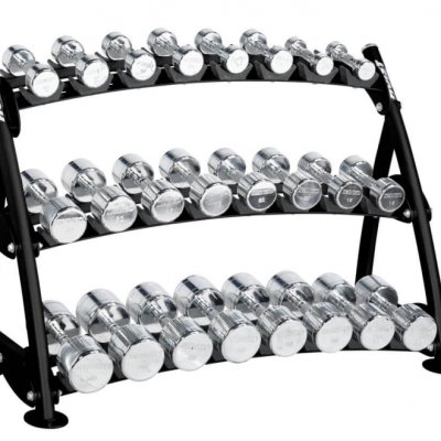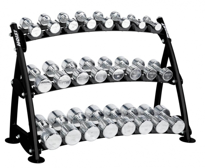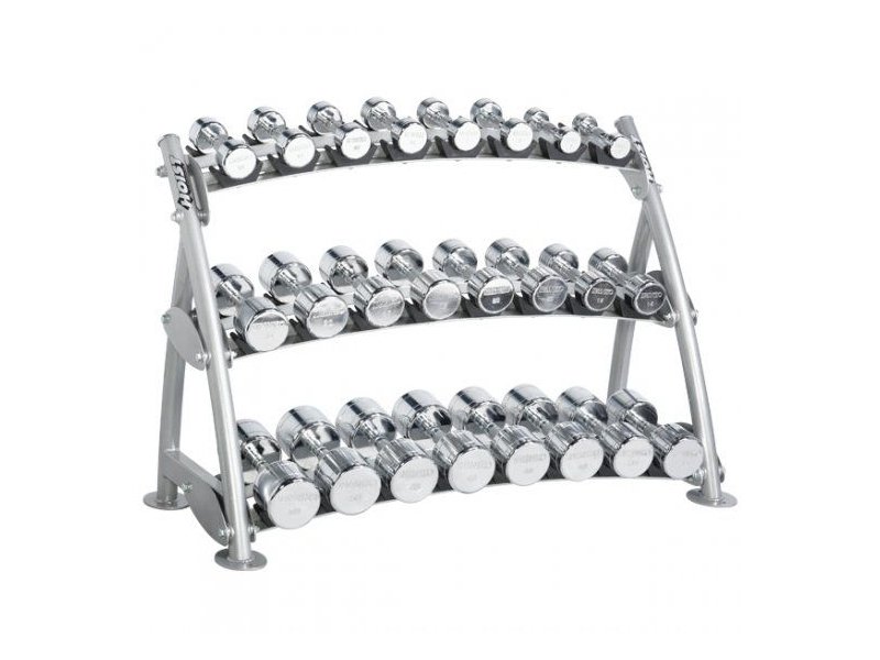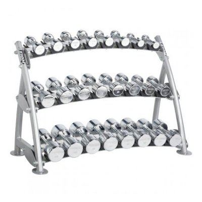 CF-3462-3 – подставка под гантели от компании Hoist. Три яруса вмещают в себя четыре пары гантелей максимальной нагрузкой 227 кг. Общая нагрузка на три яруса составляет 680 кг.