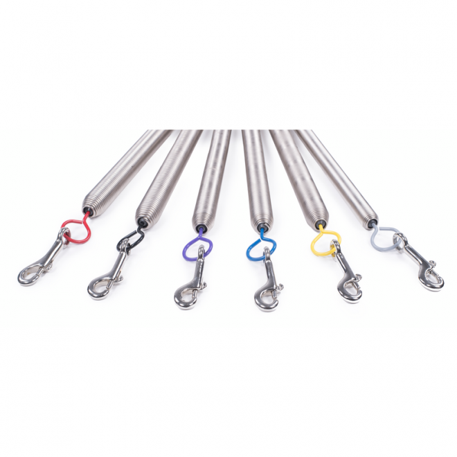 Цветные крючки свободно поворачиваются внутри пружины, что уменьшает нагрузку и продлевает срок службы.