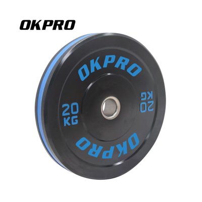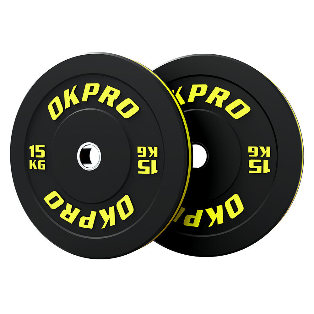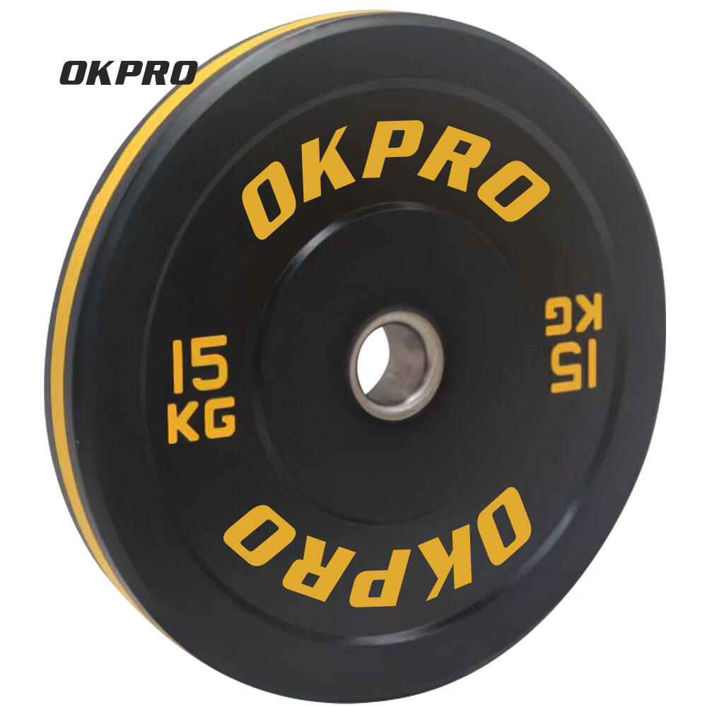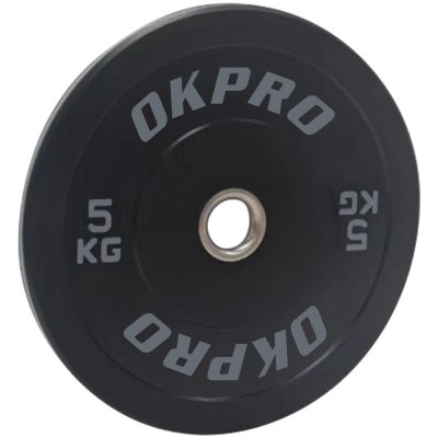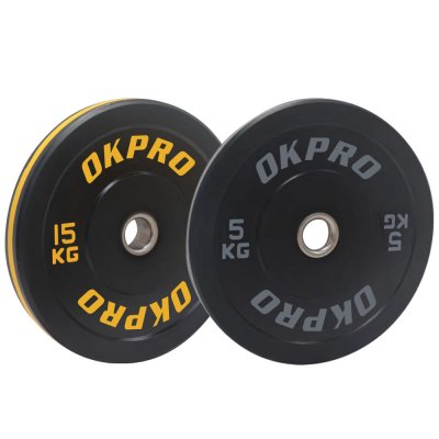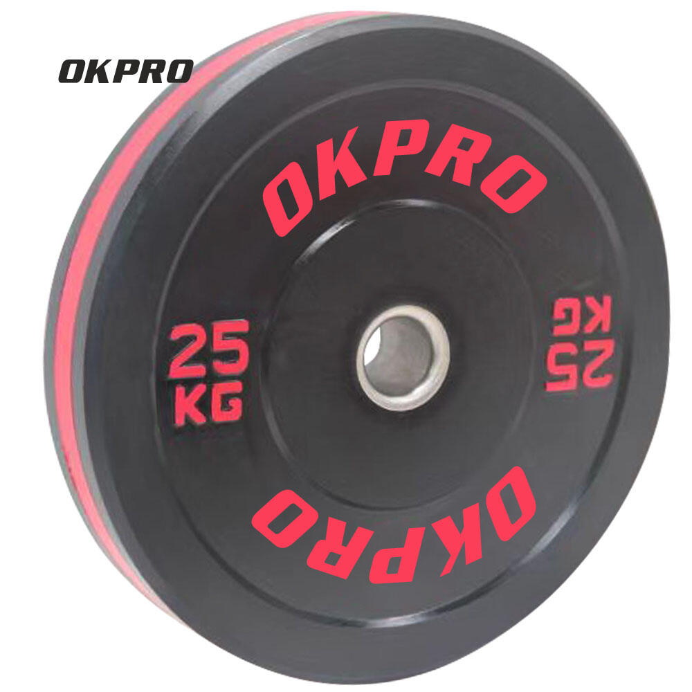 Плиты с штангой OKPRO окружены резиновыми кольцами того же цвета, что и логотип. Этот дизайн не только улучшает удобство использования, но и помогает любителям фитнеса быстро идентифицировать вес с помощью цветового кодирования, что важно для силовой тренировки.