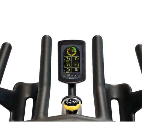 - Встроенная LCD-консоль выводит информацию о 13 параметрах: мощность (ватт), время, расстояние, калории, частота вращения педалей (RPM), пульс (при использовании нагрудного датчика), максимальная частота вращения педалей, максимальная мощность, максимальный ЧСС,