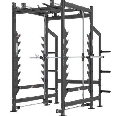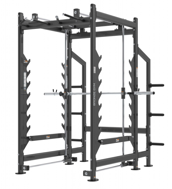 BRONZE GYM PL-1722 сочетает в себе функционал силовой рамы и машины Смита. Он предназначен для выполнения приседаний, тяг, жимов и других упражнений со штангой. Конструкция рамы имеет максимальную нагрузку до 600 кг и обеспечивает безопасность при проведении тренировки. Гриф машины Смита также имеет фиксированные положения и передвигается по хромированным направляющим с помощью кареток. Строгое, фиксированное движение по направляющим дают возможность снизить нагрузку на позвоночник, а также значительно уменьшить негативные влияние на суставы. Также, тренажер может сочетаться с универсальной скамьей, тем самым позволяя расширить комплекс упражнений. Для удобства пользования тренажер оснащен накопителями для хранения дисков. Предельно допустимый вес дисков, которые устанавливаются на гриф машины Смита – 200 кг.