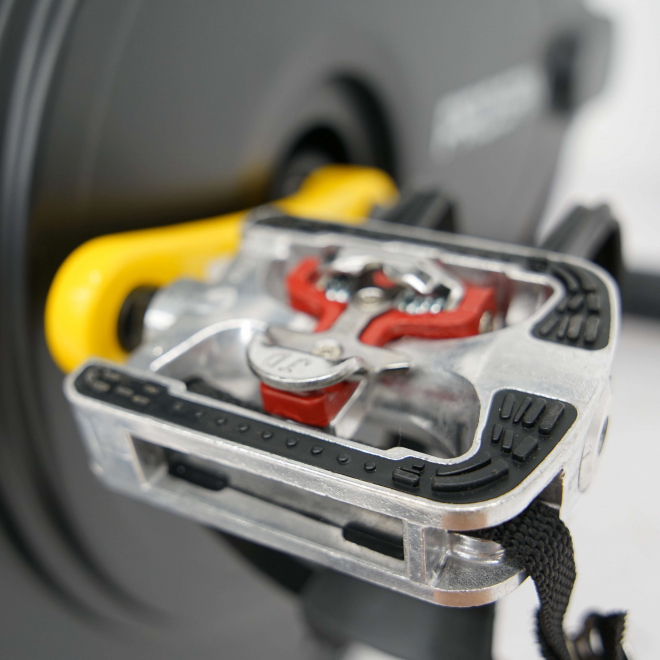К числу других преимуществ BRONZE GYM PROSPIN относятся быстро настраиваемые компенсаторы неровностей пола, износостойкие полиуретановые транспортировочные ролики и держатель для бутылки. Многопозиционный руль с подлокотниками, полностью закрытый от влаги прорезиненной полиуретановой защитой, дает возможность принять спортивное 'шоссейное' положение. Помимо всего прочего, здесь стоят отличные педали 2 в одном. Они выполнены по технологии 'Toe clip' (система рамок и ремешков на педали для крепления ноги) и, кроме того, подготовлены для использования специальной велообуви (необходим SPD переходник, приобретается отдельно). Максимальный вес пользователя 150 кг.