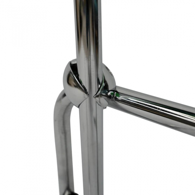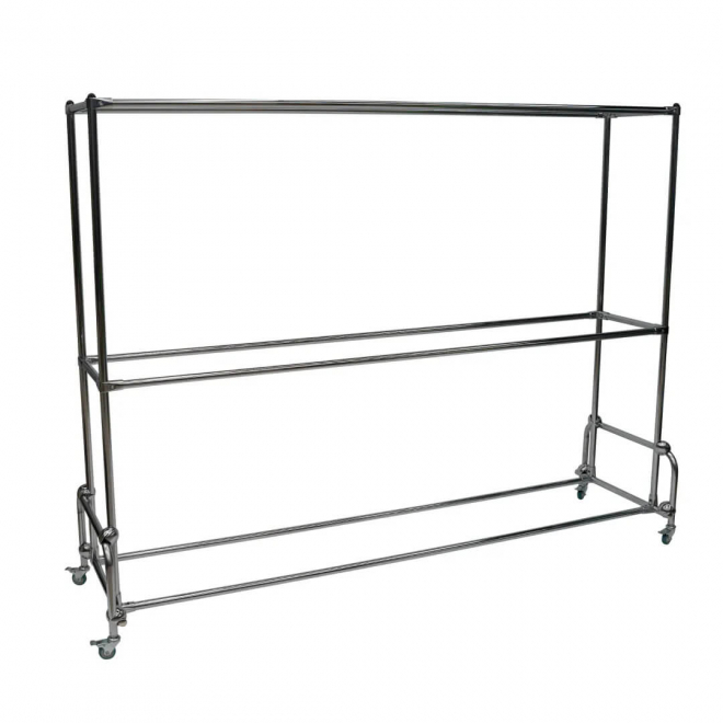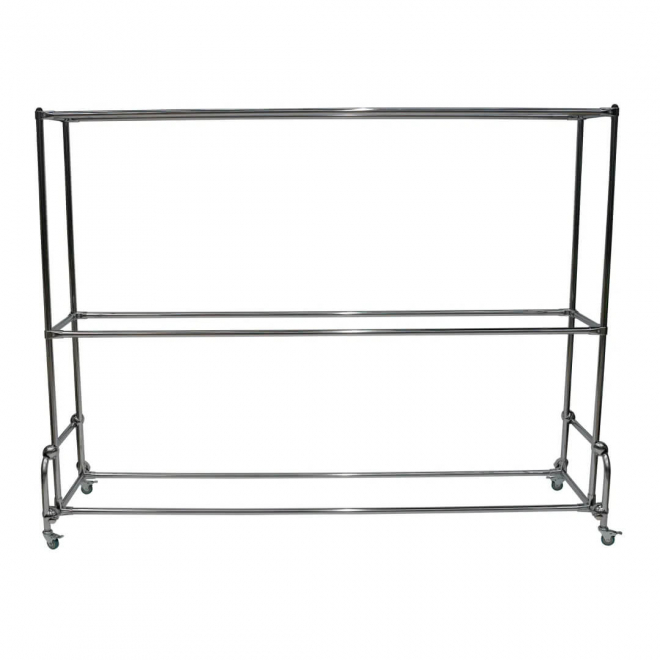 Стеллаж изготовлен из хромированной стали, снабжен транспортировочными колесами для удобства перемещения. Конструкция очень устойчива, отсутствие острых углов минимизирует возможность получения травмы. Поставляется в частично-разобранном виде с паспортом изделия.