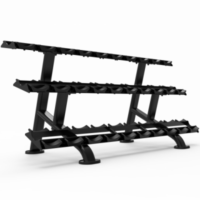 - Трехуровневый стеллаж позволяет разместить до 15 пар гантелей по 5 пар на каждом уровне,