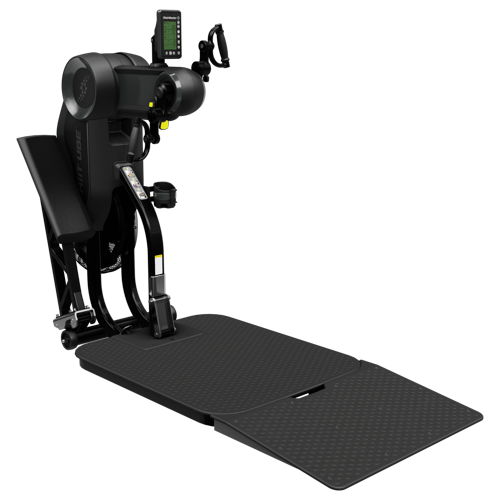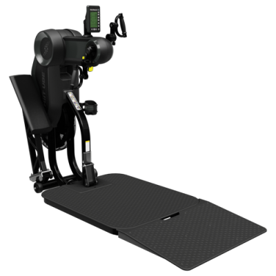 - Возможность установки пандуса для тренировок в инвалидном кресле, соответствие требованиям ADA. Уникальная система крепления съемного пандуса позволяет увеличить общую длину тренажера всего на 56 см.