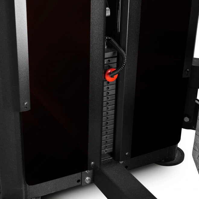 Модель оснащена стеком весом 140 кг для разнообразия в тренировках. Его габариты 125*120*225 см делают его идеальным выбором для профессиональных тренажерных залов. Полное двустороннее зачехление весового стека из поликарбоната обеспечивает надежную защиту и безопасность во время тренировок. Эта технология гарантирует, что тренажер остается в хорошем состоянии на протяжении всего периода эксплуатации, предотвращая повреждения и сохраняя его форму и функциональность.