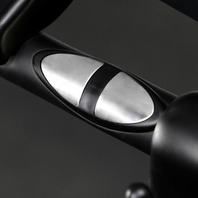 У руля тренажера регулируется угол наклона. Рукоятки с антискользящим покрытием имеют мягкие накладки и встроенную систему измерения пульса для комфортных и продуктивных тренировок.