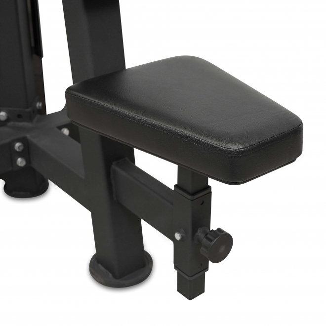PARTNER ML-809 - профессиональный тренажер коммерческого класса предназначен для выполнения упражнения жим от плеч. C помощью данной модели пользователь сможет проработать плечевые и дельтовидные мышцы. Профиль рамы тренажера, размером 80*80, выполнен из высокопрочной стали толщиной 3 мм. Благодаря двухслойному порошковому покрытию, обеспечивается защита корпуса от внешних повреждений на 99%. Прорезиненные, нескользящие рукоятки модели обеспечивают надежное сцепление рук пользователя во время занятий, что избавляет от риска получения травм. Прочный ремень, отвечает за подъем стека, общий вес которого составляет 100 кг. Сами плиты стека изготовлены из прочной легированной стали. Для простоты использования, все фиксаторы на тренажере выполнены в ярких цветах*. Установленное на модели эргономичное сиденье из высокопрочной экокожи гарантирует повышенный комфорт на протяжении всей тренировки. Подушки с полиуретановым наполнителем максимально смягчают давление на ноги. Фиксатор для ног регулируется по вертикали.